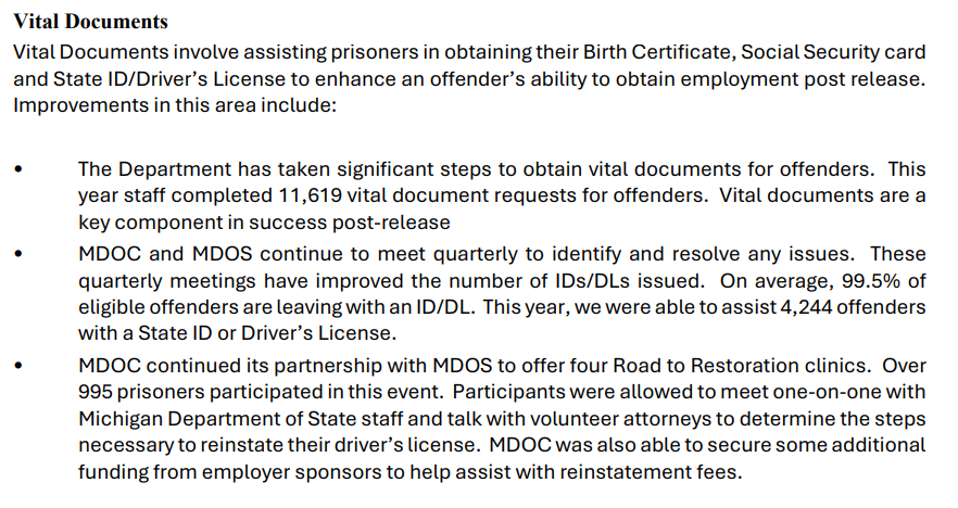 That MDOC & MDOS now report a greater than 99% success rate providing state ID or drivers license is a significant improvement, and our reentry partners also report that vital documents challenges are much less frequent than before.