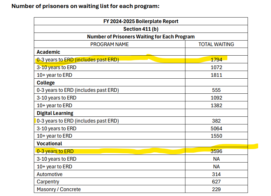 On the opposite end of the spectrum, the report shows many incarcerated people with long sentences also unable to get into programming. One of the top complaints we hear among formerly incarcerated people is that they were given almost no access to programming until the last 6 – 36 months of their incarceration, then they were rushed through academic, reentry, and behavioral programming.