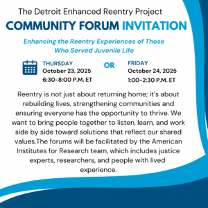 Join us for the Detroit Enhanced Reentry Project Community Forum on Thursday, October 23 (6:30-8:00pm) or Friday, October 24 (1:00-2:30pm)!